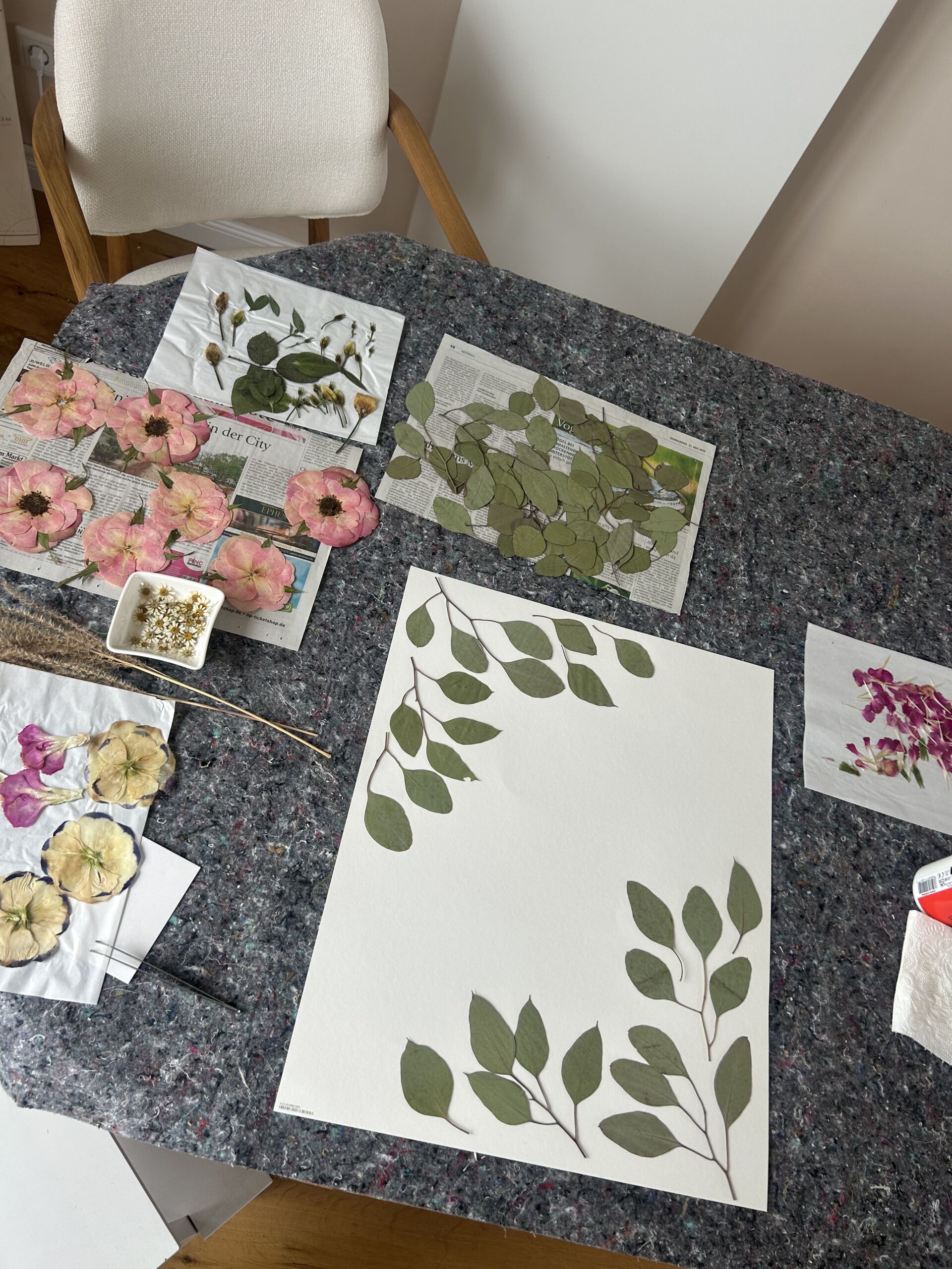 Ich nehme deinen Strauß Blüte für Blüte auseinander, presse die einzelnen Elemente sorgfältig und lasse sie mindestens 4–5 Wochen schonend trocknen.